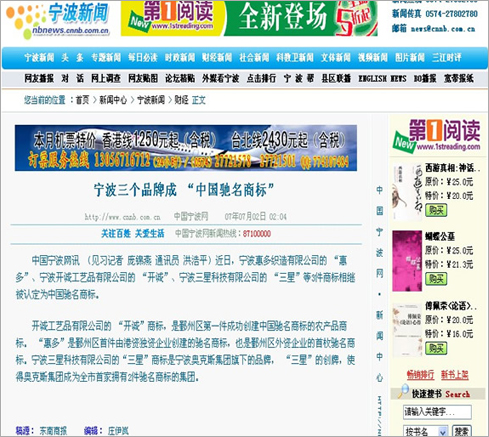 开诚工艺品有限公司的“开诚”商标,是鄞州区第一件成功创建中国驰名商标的农产品商标。“惠多”是鄞州区首件由港资独资企业创建的驰名商标,也是鄞州区外资企业的首枚驰名商标。宁波三星科技有限公司的“三星”商标是宁波奥克斯集团旗下的品牌,“三星”的创牌,使得奥克斯集团成为全市首家拥有2件驰名商标的集团。
