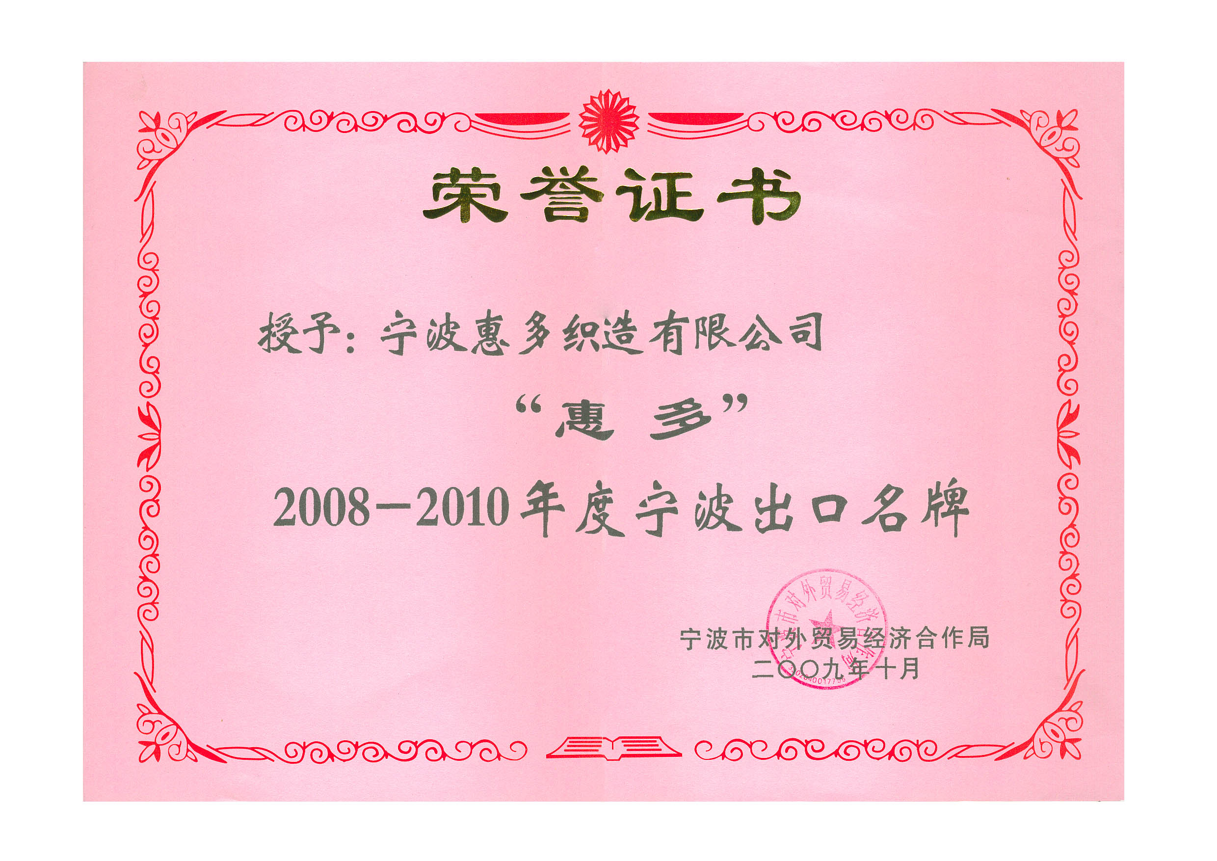 热烈庆祝我司荣获宁波市出口名牌
