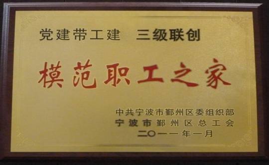 我司获得2010年度由中共宁波市鄞州区委组织部和宁波市鄞州区总工会联合颁发的“模范职工之家”荣誉称号。荣誉牌金光灿灿,放射出夺目的光彩。而这光彩的背后,更有公司充分发挥工会组织的重要作用,促进全体领导员工团结奋斗、开拓创新、无私奉献的精神在闪光,是呕心沥血、和谐共建、团结员工的坚实足迹在闪光。