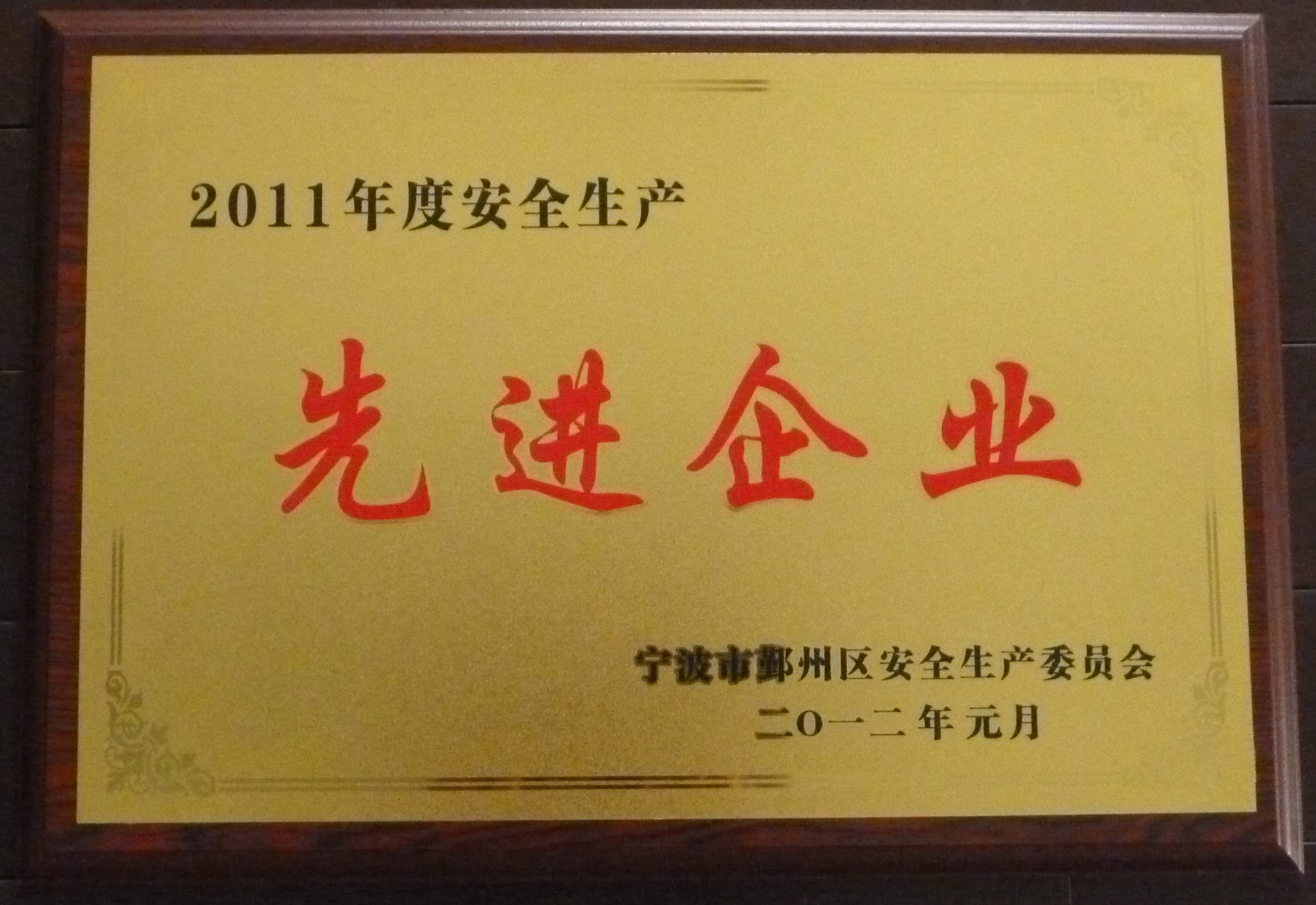 我司获得2011年度由宁波市鄞州区安全生产委员会颁发的“安全生产先进企业”荣誉称号。这沉甸甸的荣誉牌,充分展示了公司对企业的安全生产工作高度重视与对安全生产资金、设备、科技的充足投入,同时也体现了我司安全公职人员的高水平的专业素质和严谨的敬业精神。